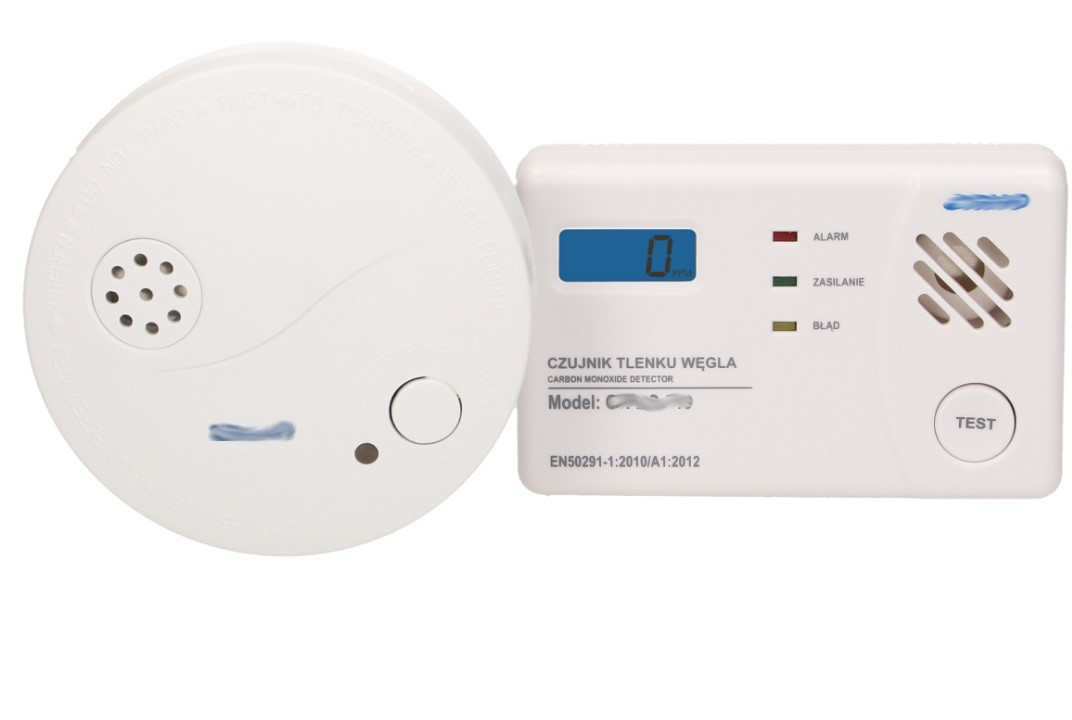 Zestaw składa się z dwóch detektorów: tlenku węgla i dymu - to nowoczesne urządzenie alarmowe zaprojektowane do ciągłego monitoringu stężenia tlenku węgla (czadu) z podświetlanym wyświetlaczem LCD. Wysokiej jakości czujnik elektrochemiczny „ECO-CELL”, powiadomienie optyczne i dźwiękowe, przycisk TEST pozwala sprawdzić poprawność działania czujnika, funkcja pomiaru stężenia tlenku węgla w zakresie od 30 ppm do 999 ppm, funkcja pamięci (zapamiętuje ostatnie stężenie tlenku węgla, które wywołało alarm), sygnalizacja słabych baterii. Zgodność z normą EN 50291-1:2010/A1:2012. Średni czas żywotności czujnika wewnętrznego wynosi ok. 6 lat. Koniec żywotności czujnika sygnalizowany jest sygnałem dźwiękowym, komunikatem na wyświetlaczu oraz miganiem diody. To urządzenie przeznaczone do monitorowania zamkniętych pomieszczeń pod kątem obecności dymu oraz do wczesnego wykrywania pożaru. Czujnik fotoelektryczny wykrywa widzialny dym powstający w bezpłomieniowym, początkowym stadium pożaru, powiadomienie optyczne i dźwiękowe, zasilanie bateryjne: 1 × 9V DC (w zestawie), poziom głośności: >85 dB/3 m, przycisk TEST pozwalający sprawdzić poprawność działania czujnika, sygnalizacja słabych baterii, zgodność z normą EN 14604: 2005 + AC1: 2008 potwierdzone przez jednostkę certyfikującą BSI-KM550646.