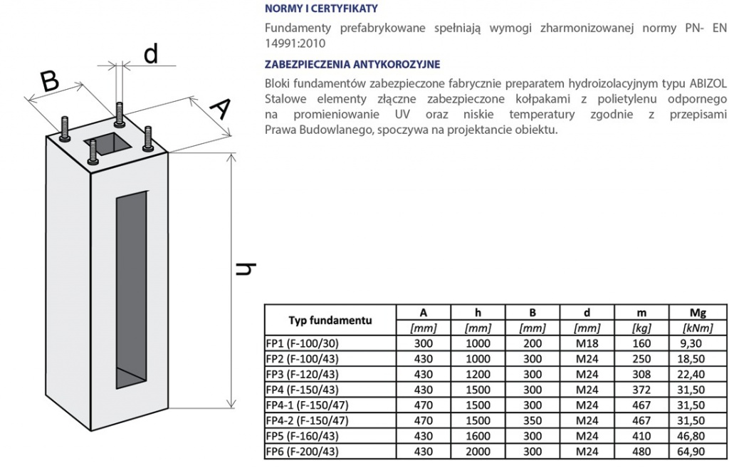 Bloki fundamentów zabezpieczone fabrucznie preparatem hydroizolacyjnym typu ABIZOL. Stalow elementy złączne zabezpieczone kołpakami z polietylenu odpornego na promieniowanie UV oraz niskie temperatury zgodnie z przepisami Prawa Budowlanego, spoczywa na projektancie obiektu.