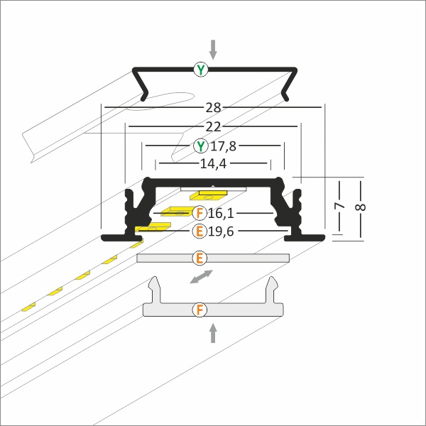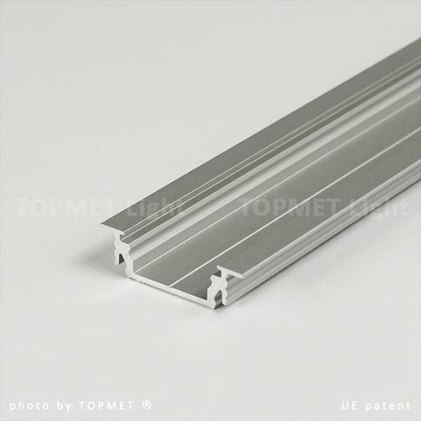 GROOVE14 – profil wpustowy. Profil aluminiowy do wpuszczenia w szczelinę o szerokości 22mm, wystający ponad powierzchnię montażową tylko 1mm. Mocować można w ścianie, suficie, płytkach, meblach we frezie, wklejenie lub za pomocą uchwytu SU/GR/CO.