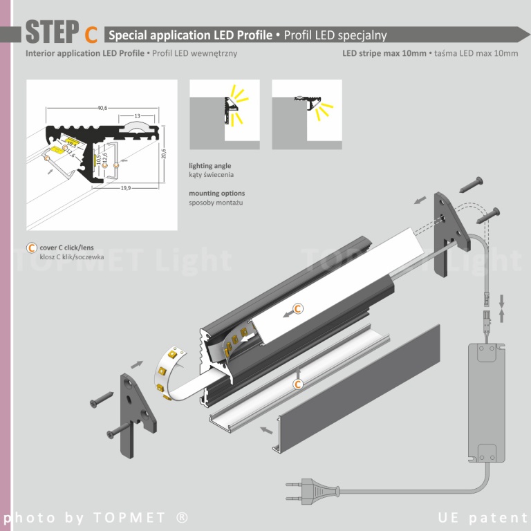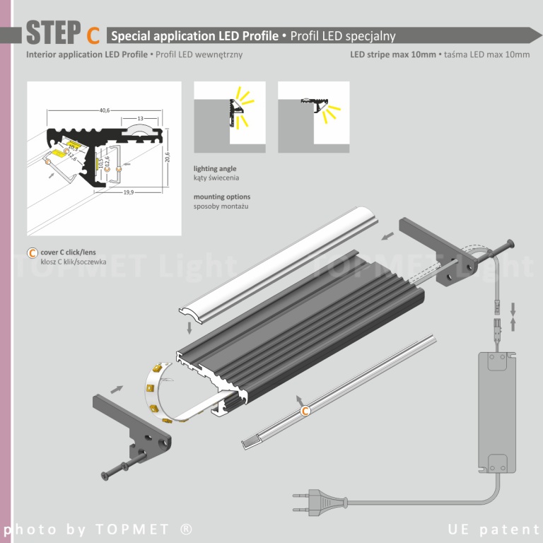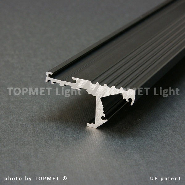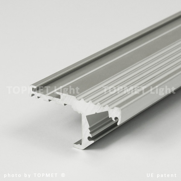 STEP - profil aluminiowy STEP przeznaczony do montażu na krawędzi stopni schodowych w dwóch położeniach, w celu wzmocnienia, a zarazem oświetlenia stopni. Stanowi łagodne przejście, w przypadku różnicy poziomów, między płytkami ceramicznymi a wykładziną podłogową lub parkietem. Użycie wkładki antypoślizgowej oraz ryflowanego paska aluminium zapewnia dodatkowe bezpieczeństwo. Idealny do restauracji, sklepów oraz wnętrz użyteczności publicznych. Proponujemy dwa sposoby montażu profilu, a co za tym idzie możliwość oświetlenia podstopnicy lub krawędzi stopnia. Możliwe zamontowanie taśmy LED do 10mm szerokości. Moc zależna jest od rodzaju zastosowanego źródła LED. Profil idealnie odprowadza ciepło taśmy, co wpływa na przedłużenie jej żywotności.