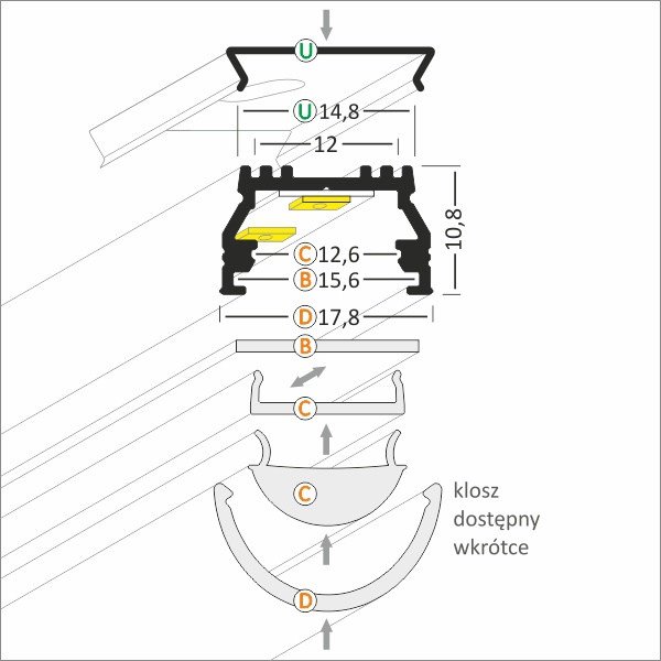 Mały profil o wielu zastosowaniach. Dobrze odprowadza ciepło. Kompatybilny z częścią akcesoriów - kloszami i uchwytami. W zastosowaniu z nowym kloszem klik nakładanym od zewnątrz - można uzyskać wodoszczelność (w układzie poziomym z kloszem od góry).