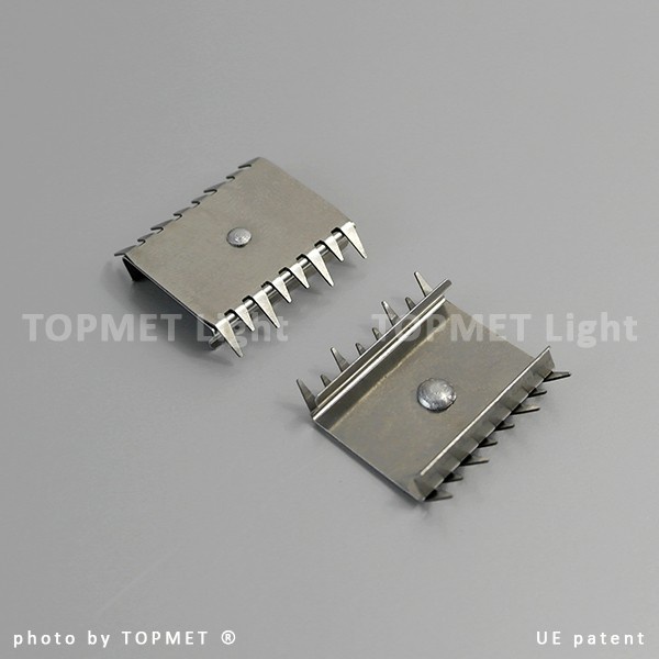 Element wykonany ze sprężystej blachy nierdzewnej, służący do montażu wpustowego np. w drewnie i karton-gipsie.