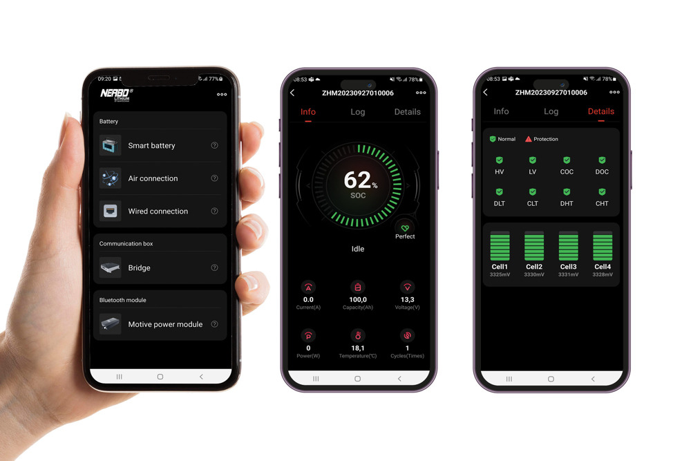 Akumulatory Nerbo Lithium są znakomitym zamiennikiem dla akumulatorów kwasowo ołowiowych. Technologia litowo-żelazowo-fosforanowa Li-FePO4 (LFP) łączy w sobie zalety dużej pojemności, wysokiej wydajności prądowej, długiej żywotności cyklicznej i kalendarzowej oraz bezpieczeństwa stosowania. Akumulator LFP może pracować w dowolnym położeniu, nie występuje w nim efekt pamięciowy zmniejszający realną pojemność baterii wraz z jej użytkowaniem, a samorozładowanie jest niewielkie. Wybrany model wyposażony jest w komunikację radiową 2,4 GHz współpracująca z aplikacją.