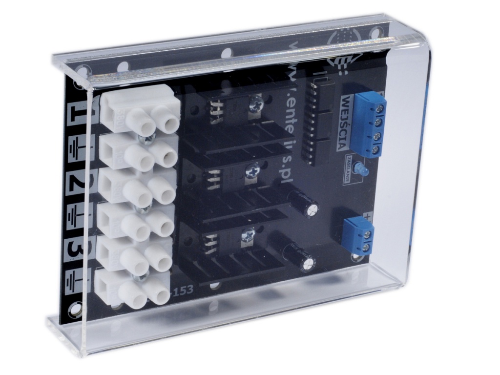 Wzmacniacz LED RGB EPM-153 pozwala na łatwą i szybką rozbudowę oświetlenia LED RGB (lub 3 obwodów mono) w przypadku kiedy moc oświetlenia LED przekracza możliwości zastosowanego ściemniacza lub sterownika LED. Umożliwia także budowanie dużych instalacji LED sterowanych z jednego miejsca. Dzięki trzem kanałom idealnie nadaje się do oświetlenia LED RGB. Wzmacniacz LED RGB posiada trzy potężne kanały wyjściowe o obciążalności 15 A każdy! Daje to do dyspozycji moc aż 540 W przy zasilaniu z 12 VDC oraz aż 1080 W przy zasilaniu 24 VDC. Wbudowane filtry przeciwzakłóceniowe gwarantują bezpieczna pracę. Separacja galwaniczna wejść oraz automatyczne wykrywanie polaryzacji ułatwiają montaż i eliminują problemy z zasilaniem z różnych faz lub z pętlami masowymi.