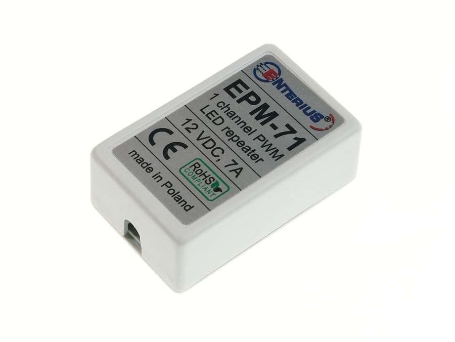 EPM-71 to miniaturowy wzmacniacz LED mono (jednokanałowy) dla taśm LED zasilanych napięciem 12 V. Posiada wyjście o obciążalności 7 A i nadaje się nie tylko do taśm LED ale również wszelkich źródeł światła LED zasilanych napięciowo (czyli stałym, stabilizowanym napięciem) i współpracujących ze ściemnianiem za pomocą modulacji PWM. Będzie zatem działał poprawnie z większością modułów LED oraz niektórymi zamiennikami LED żarówek halogenowych zasilanymi niskim napięciem 12 VDC. Wzmacniacz LED mono EPM-71 pozwala na łatwą i szybką rozbudowę instalacji LED w przypadku kiedy moc taśm LED przekracza możliwości zastosowanego ściemniacza lub sterownika.