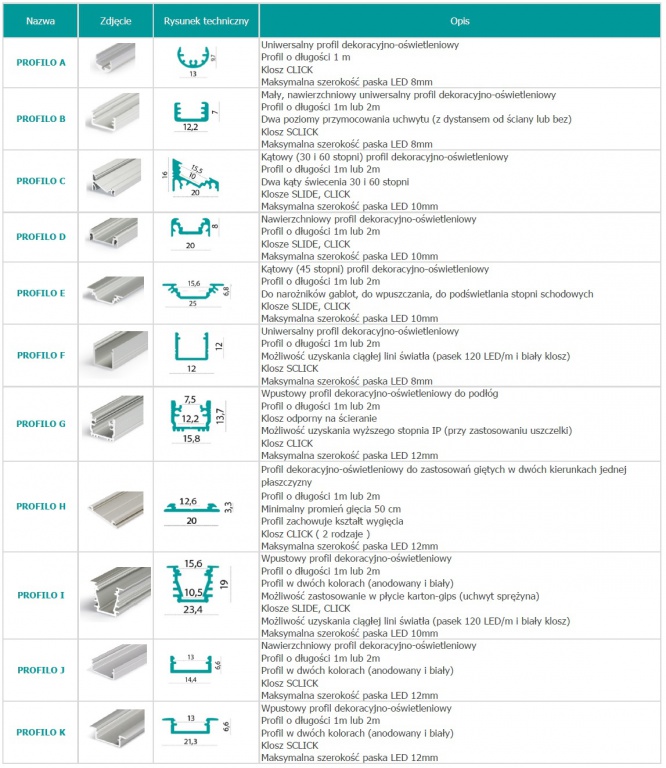 Oferujemy Wam pełen komplet przeznaczony do montażu taśm LED – PROFILO. Oprócz samych profili, wśród których każdy znajdzie odpowiadający mu model, w serii PROFILO znajdziecie również uchwyty montażowe, zaślepki oraz szybki. Wszystko co jest potrzebne aby w sposób w pełni profesjonalny i estetyczny stworzyć wymarzone oświetlenie z użyciem taśm LED.