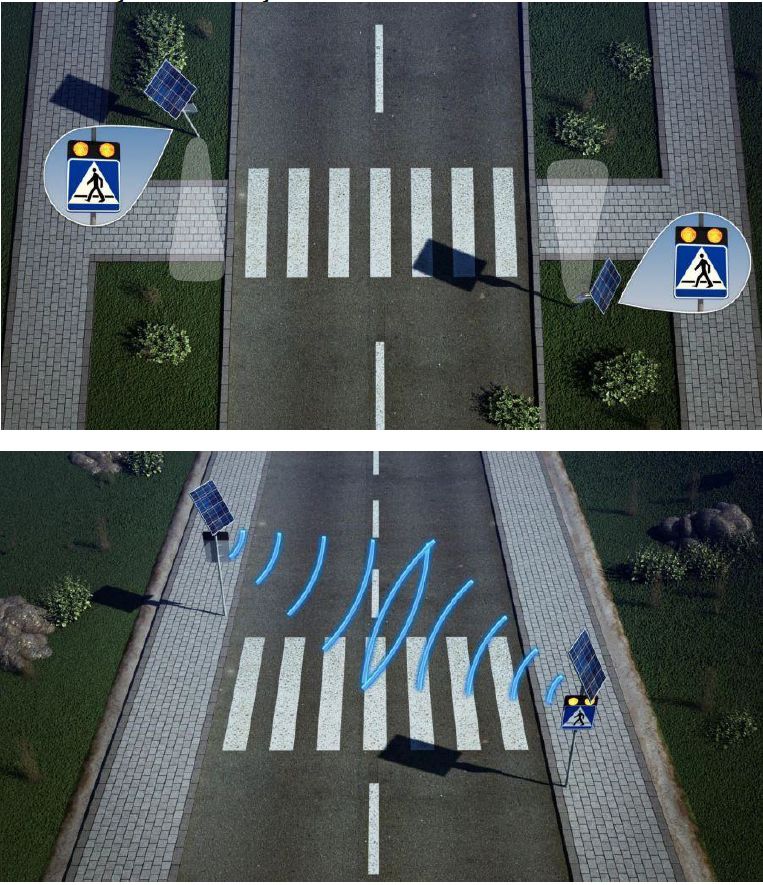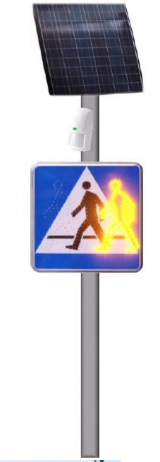 - Znak D6 KROCZACY LUDZIK może być aktywowany poprzez dualny czujnik ruchu aktywujący znak tylko w momencie gdy pieszy znajdzie się w pobliżu przejścia dla pieszych lub miejsc niebezpiecznych.