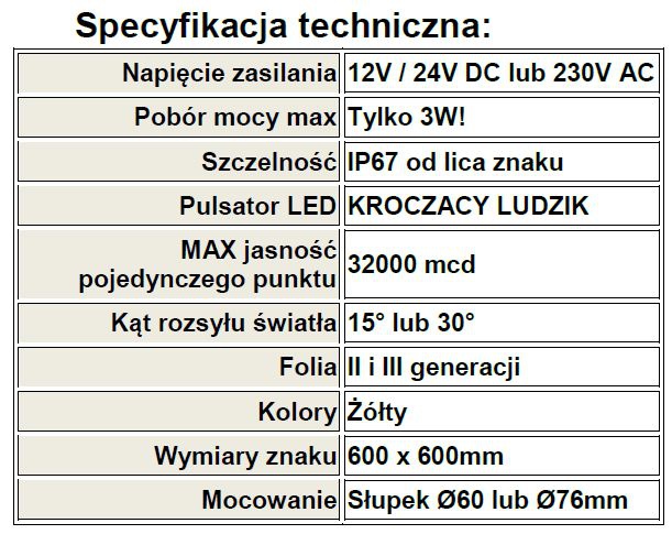 - Znak aktywny D6 600x600mm wraz z funkcją „KROCZACY LUDZIK” LED.