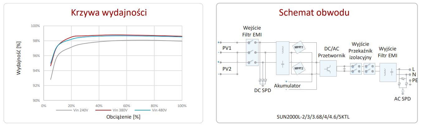 • Opatentowana przez Huawei topologia o wysokiej wydajności, wydajność maksymalna 98,6%, wydajność europejska 98,0%