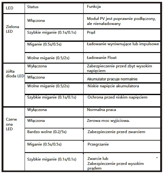 | Zakres śledzenia MPPT | (Napięcie akumulatora + 1.0V)~Voc*0.9 *2 | |||