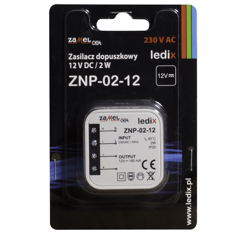 Zasilacz ZNP to profesjonalny zasilacz impulsowy. Zasilacz przeznaczony jest do współpracy z produktami LEDIX (oprawy, sterowniki, odbiorniki radiowe) zasilanymi napięciem o wartości 14 V DC. Przeznaczony jest do bezpośredniego montażu w puszce instalacyjnej. Produkt posiada zabezpieczenia przeciwzwarciowe oraz przeciążeniowe, które zwiększają bezpieczeństwo jego użytkowania. Wysoka sprawność oraz bardzo mały pobór mocy w trybie czuwania sprawiają, iż jest to rozwiązanie bardzo ekonomiczne, przeznaczone do pracy ciągłej. Zasilacz spełnia wymagania norm zharmonizowanych.