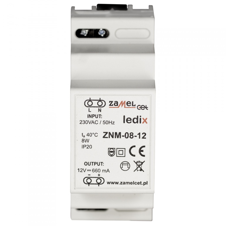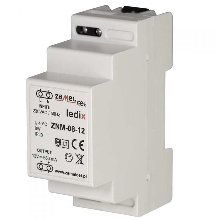 Zasilacz ZNM to profesjonalny zasilacz impulsowy. Zasilacz dedykowany jest do współpracy z produktami serii LEDIX. Urządzenie wykonane w obudowie 3-modułowej, przeznaczone do montażu na szynie TH-35. Zasilacz cechuje bardzo niski pobór mocy w trybie czuwania, wysoka sprawność na poziomie 79%, duża stabilność napięcia wyjściowego oraz długoterminowa niezawodność.