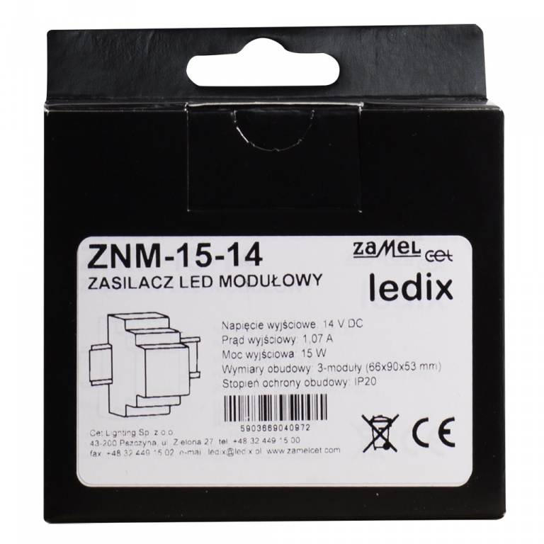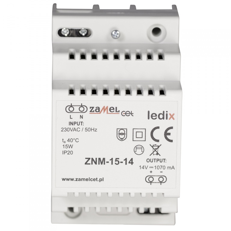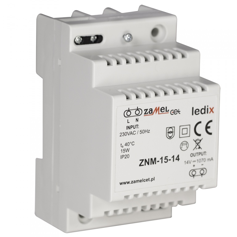 Zasilacz ZNM to profesjonalny zasilacz impulsowy. Zasilacz dedykowany jest do współpracy z produktami serii LEDIX. Urządzenie wykonane w obudowie 3-modułowej, przeznaczone do montażu na szynie TH-35. Zasilacz cechuje bardzo niski pobór mocy w trybie czuwania, wysoka sprawność na poziomie 79%, duża stabilność napięcia wyjściowego oraz długoterminowa niezawodność.