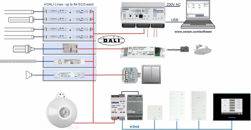 - Przełączanie i regulacja do 256 elektronicznych układów zasilających DALI