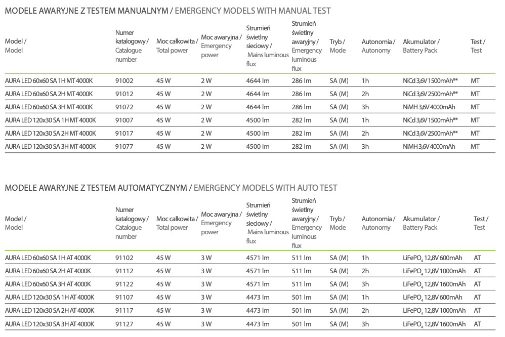 Dostępne moce świecenia awaryjnego: 2W lub 3W