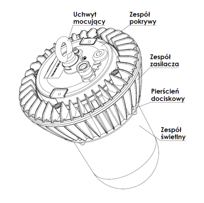 Oprawa wykonana jest jako hermetyczna, zamknięta konstrukcja w ramach której możemy wydzielić trzy