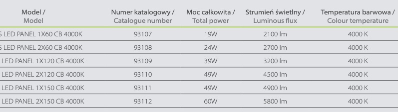 Zakres dostępnych mocy opraw: od 19W do 60W