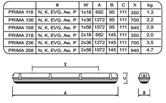 K - oprawy kompensowane, ze statecznikiem EEI = B