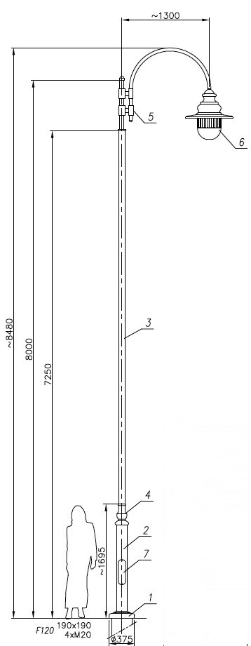 Latarnia ST3 - słup H=8,5m, przewody, wysięgnik + oprawa E27