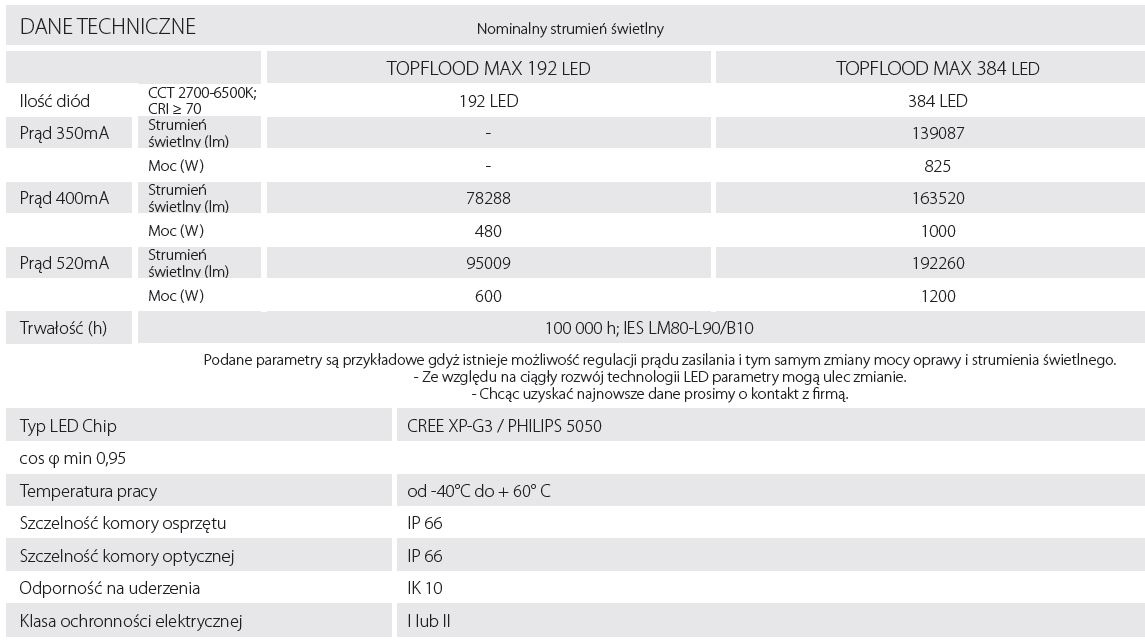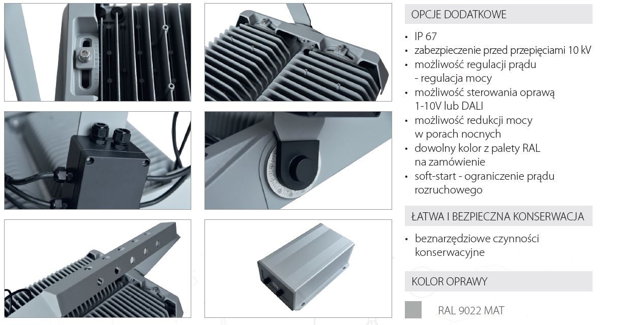 Naświetlacz przeznaczony do oświetlenia obiektów sportowych, placów, obiektów (iluminacja). Wykonany z odlewu aluminiowego, zwarta i lekka konstrukcja.