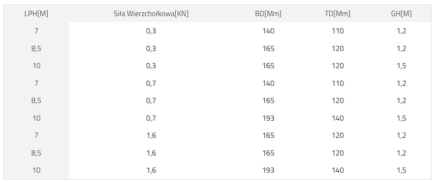 | LPH[M] | Siła Wierzchołkowa[KN] | BD[Mm] | TD[Mm] | GH[M] |