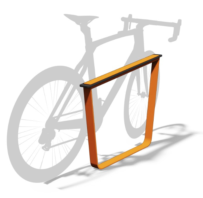 Stojak do dwustronnego parkowania rowerów. Aby zapewnić miękki kontakt z rowerem lub hulajnogą, jest przymocowany do stalowej konstrukcji nośnej gumowy pas