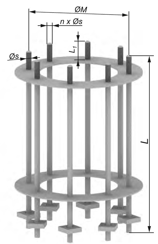 Wykonany ze stali konstrukcyjnej, Składa się z kotew płytowych spełniających wymagania normowe odn. zakotwiczeń oraz pierścieni stabilizujących, pozycjonujących położenie kotew