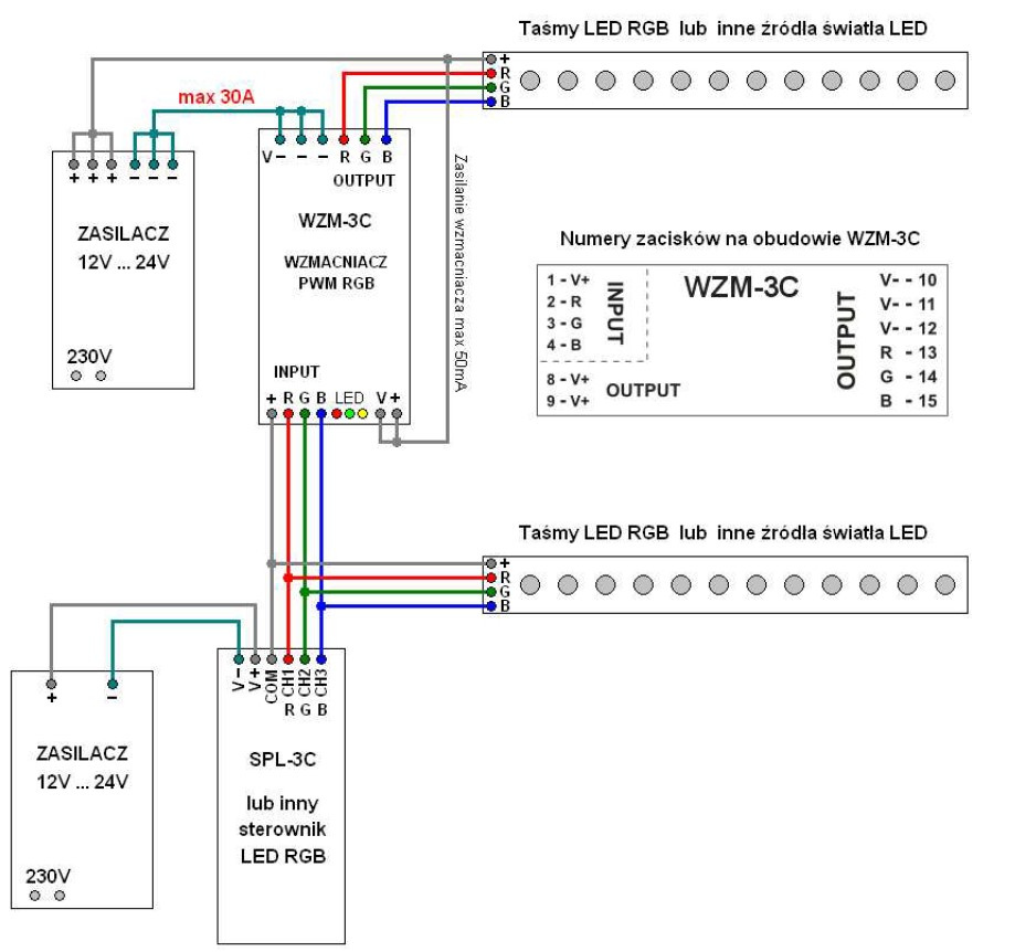 Wzmacniacz może współpracować z dowolnymi sterownikami taśm LED RGB ze wspólnym plusem, np. ze sterownikiem SPL-3C. Do jednego sterownika można podłączyć nawet kilkanaście wzmacniaczy WZM-3C zwiększając tym samym ilość sterowanych taśm lub diod LED RGB.