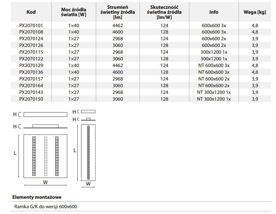 Montaż: w sufitach podwieszanych 600x600 o widocznej konstrukcji nośnej oraz G/K do wersji 600x600