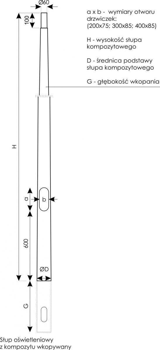 Słup oświetleniowy z kompozytu wkopywany