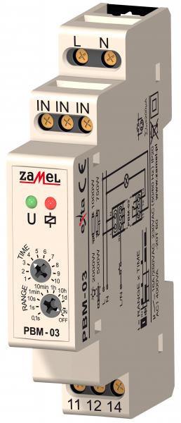 Przekaźnik bistabilny PBM-03/24V służy do sterowania oświetleniem lub dowolnym innym urządzeniem za pomocą równolegle podłączonych przycisków jednobiegunowych. Kolejne naciśnięcia dowolnego z przycisków powodują załączenie lub wyłączenie urządzeń podłączonych do zacisków wyjściowych. Impulsem sterującym może być sygnał z linii zasilającej. Po podaniu impulsu, który załączy odbiornik, a następnie odmierzeniu nastawionego czasu t następuje automatyczne wyłączenie odbiornika. Zastosowanie układu daje możliwość stworzenia “inteligentnych” systemów sterowania oświetleniem.