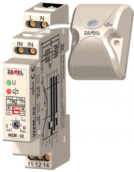 Wyłącznik zmierzchowy WZM-02/ SOS służy do sterowania urządzeniami oświetleniowymi lub innymi odbiornikami energii w zależności od natężenia oświetlenia. Układ załącza oświetlenie o zmierzchu i wyłącza o świcie. Urządzenie posiada dwa zakresy natężenia oświetlenia, w których użytkownik ma możliwość płynnej regulacji progu załączenia. Układ posiada funkcję ciągłego załączenia odbiornika (ON) podłączonego do zacisków wyjściowych oraz funkcję pracy automatycznej (AUTO). Zewnętrzna sonda natężenia oświetlenia SOS-01 (w komplecie) przekazuje sygnał do wyłącznika zmierzchowego WZM-02. Przewód przyłączeniowy sondy o długości maksymalnej 50 m umożliwia umieszczenie jej w dogodnych miejscach.